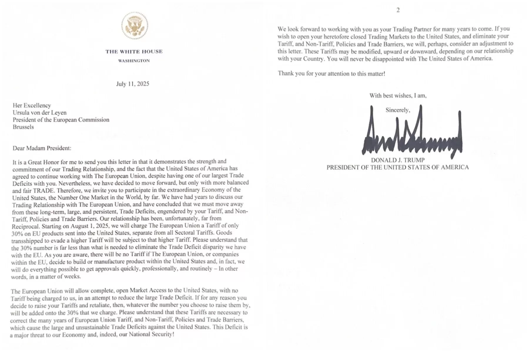 Gentile Signora Presidente, E’ per me un grande onore inviarLe questa lettera, in quanto dimostra la forza e l’impegno delle nostre relazioni commerciali e il fatto che gli Stati Uniti d’America abbiano accettato di continuare a collaborare con l’Unione Europea, nonostante uno dei nostri maggiori deficit commerciali con Lei. Ciononostante, abbiamo deciso di andare avanti, ma solo con un COMMERCIO più equilibrato ed equo. Pertanto, La invitiamo a partecipare alla straordinaria economia degli Stati Uniti, di gran lunga il mercato numero uno al mondo. Abbiamo avuto anni per discutere delle nostre relazioni commerciali con l’Unione Europea e abbiamo concluso che dobbiamo abbandonare questi deficit commerciali a lungo termine, ampi e persistenti, generati dalle Sue politiche tariffarie e non tariffarie e dalle Sue barriere commerciali. Le nostre relazioni sono state, purtroppo, tutt’altro che reciproche. A partire dal 1 agosto 2025, applicheremo all’Unione Europea una tariffa di solo il 30% sui prodotti UE spediti negli Stati Uniti, distinta da tutte le tariffe settoriali.