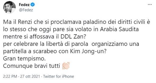 Su Twitter scrive: “Ma il Renzi che si proclamava paladino dei diritti civili è lo stesso che oggi pare sia volato in Arabia Saudita mentre si affossava il DDL Zan? Per celebrare la libertà di parola organizziamo una partitella a scarabeo con Kim Jong-un? Gran tempismo“.
