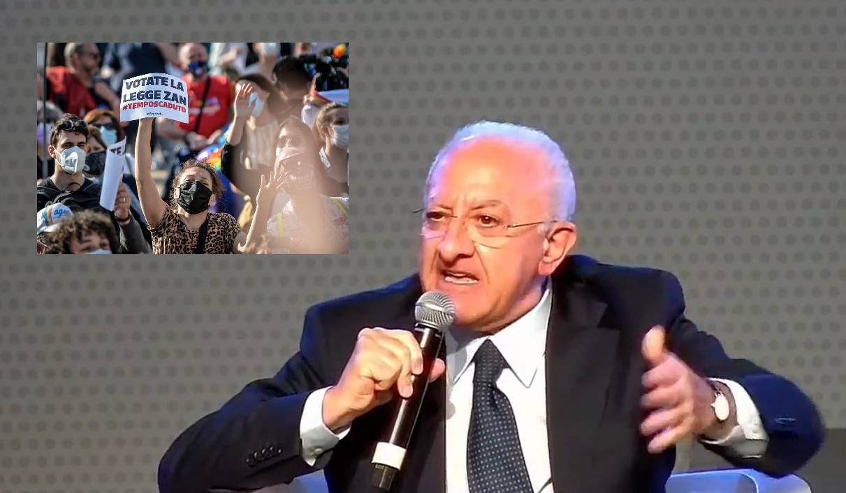 De Luca spara a zero contro il Ddl Zan. Per presunte posture ideologiche, per il contestatissimo e dibattutissimo articolo 7, per ragioni elettorali anche. Le dichiarazioni alla festa dell’Unità di Bologna domenica sera. Il punto sul quale si stanno concentrando per la maggior parte i titoli dei giornali: la contrarietà del governatore alla “istituzione della Giornata nazionale contro l’omofobia, la lesbofobia, la bifobia e la transfobia”, proprio quell’articolo 7 che non gli avrebbe fatto votare il disegno di legge.