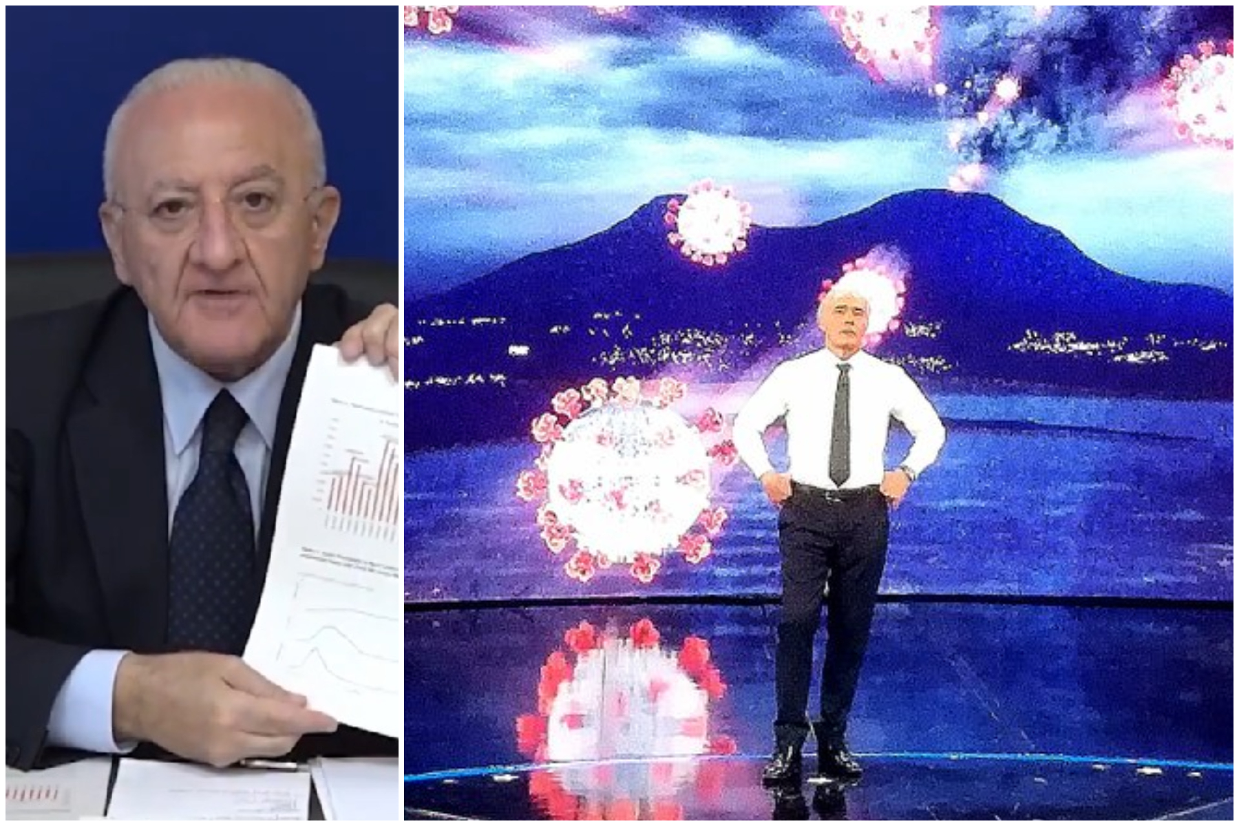 Continua il duello a distanza tra Vincenzo De Luca e il conduttore de “Non è l’Arena” Massimo Giletti, particolarmente concentrato sull’emergenza coronavirus in Campania e non nelle altre regioni d’Italia. Emergenza riassunta in studio con l’immagine del Vesuvio dalla quale fuoriescono le immagini del virus.