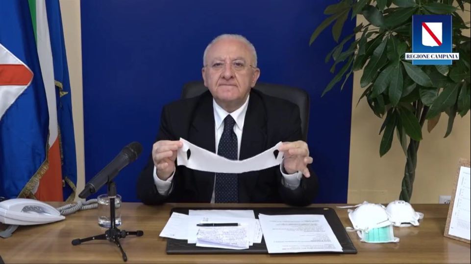 “In Campania sono arrivati 552mila mascherine ma queste cose ci vuole davvero una fantasia accesa per definirle mascherine. A meno che non si pensi alle maschere che utilizzano i nostri nipoti a carnevale. Questa va bene come maschera per Bunny il coniglietto. Se ve la mettete le vostre orecchie escono da queste fessure e avete la faccia di Bunny il coniglietto. Facciamo un sorriso anche in momenti difficili ma non le chiamate mascherine. Per quanto mi riguarda, ho scoperto che hanno una grande efficacia per pulire gli occhiali, sono davvero un prodotto eccezionale, ma negli ospedali lasciamo perdere…”.