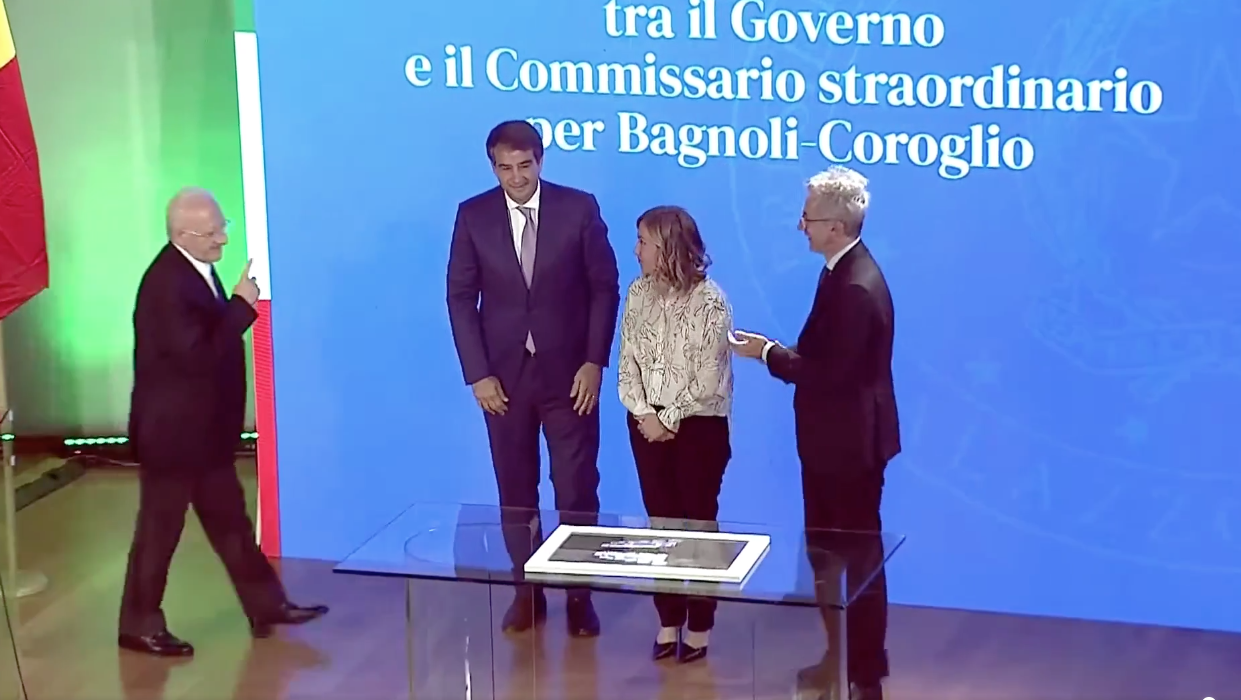 Il ‘ring‘ questa volta è l’Auditorium della Porta del Parco a Bagnoli dove governo in pompa magna (c’è anche il capo della cultura Sangiuliano nella ‘sua’ Napoli) e le istituzioni locali, a partire dal governatore e dal sindaco di Napoli Gaetano Manfredi (che è commissario di governo per il Sin Bagnoli-Coroglio), si sono incontrati per la firma del protocollo di intesa che assegna un miliardo e duecento milioni per il completamento di tutte le opere necessarie al recupero del sito di interesse nazionale Bagnoli-Coroglio.