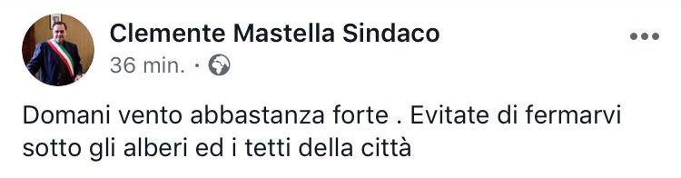 IL PRAGMATISMO DI MASTELLA – Ma una soluzione c’era, anche se non potevamo saperlo prima… Infatti a Benevento il sindaco Clemente Mastella affronta con grande pragmatismo l’allerta meteo: “Domani vento abbastanza forte. Evitate di fermarvi sotto gli alberi ed i tetti della città“. Se nel 2011 l’avessimo votato, quando era uno dei candidati a sindaco di Napoli, chissà quante cose avrebbero potuto imparare i nostri figli nei giorni che sono stati persi in questi anni e quante ferie in più ci saremmo potuti godere in giro con i nostri figli e non chiusi in casa…