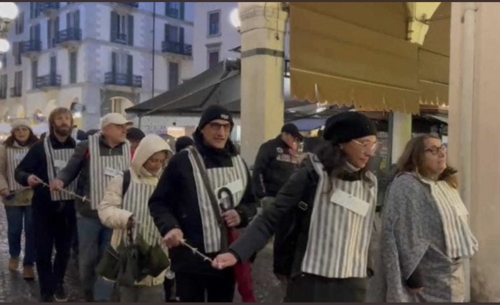 Chiamatela se volete provocazione: ma è solo uno spettacolo indecente, che sta suscitando durissime critiche e polemiche, inguardabile: decine di persone in pettorine a strisce, qualcuna con un numero appiccicato, aggrappati a una corda che ricorda un filo spinato come quelli che delimitavano i campi di lavoro e di eliminazione del Terzo Reich. Non è certo la prima volta che i No Green Pass fanno riferimento, parallelismi, paragoni tra la gestione della pandemia e le misure messe in atto per contrastare e contenere il contagio, permettendo la ripartenza dell’economia, alle deportazioni naziste. Questa volta la messinscena ha superato sicuramente i precedenti riferimenti.