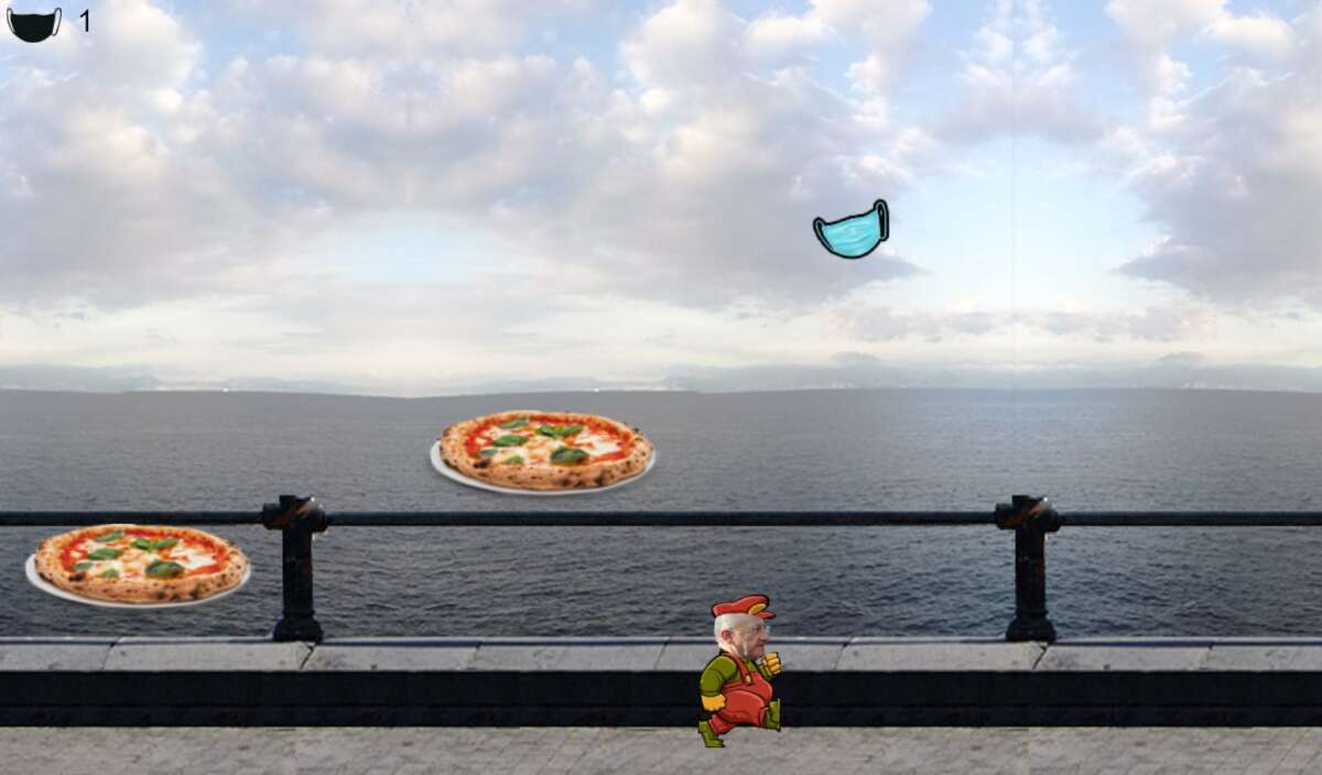 Sullo sfondo si vede il Vesuvio. E il governatore, con una salopette rossa e cappellino rosso come Super Mario, che corre e raccoglie mascherine per accumulare punti e salta sulle pizze Margherite. Gli ostacoli sono rappresentati dai runner, dalla sagoma del Presidente di Giuseppe Conte, dal direttore del quotidiano Libero Vittorio Feltri.