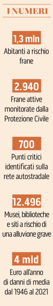 Sui 7016,4 km di rete autostradale sono identificati circa 700 punti critici, sulla rete ferroviaria lunga 16.723 km sono circa 1.800, ovviamente sotto controllo e oggetto di interventi, e sulla rete stradale lunga 167.565 km e soprattutto sui 132.000 km di strade provinciali gli smottamenti sono cronaca quotidiana. E poi c’è la nostra anima, l’identità culturale che finisce nel fango. Sono esposti al rischio di una alluvione grave 12.496 tra musei, biblioteche e siti archeologici, altri 28.483 sono a rischio medio e 39.025 a bassa pericolosità, calcola l’Ispra. Un brivido lungo la schiena degli storici dell’arte e degli archeologi e di tanti italiani. E oggi è Villa Montalvo, a due passi da Campi Bisenzio, che ha dovuto assistere alla perdita di 50mila libri portati via dalla piena, trascinati e incastrati tra rami di alberi, auto e vari rifiuti.