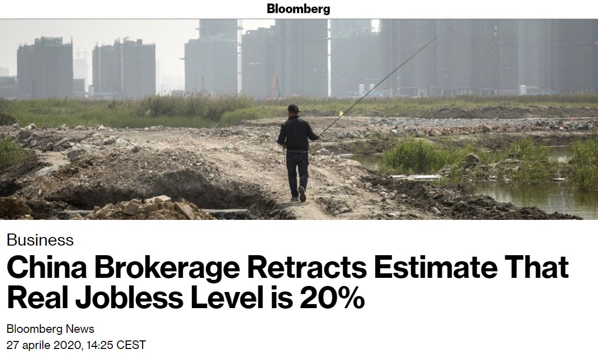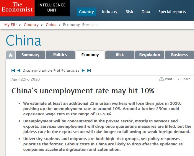 Tornando ai dati sulla disoccupazione, secondo gli analisti dell’Economist Intelligence Unit di Londra il tasso reale di inoccupati in Cina sarebbe attualmente attorno al 10 per cento, ben più alto rispetto ai numeri ufficiali forniti da Pechino. L’articolo inoltre prevedeva come nei prossimi 10 mesi circa 250 milioni di lavoratori cinesi potranno perdere tra il 10 e il 50% dei loro guadagni.