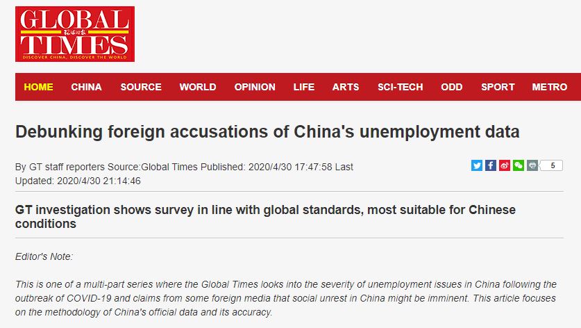 Le analisi occidentali sono state però aspramente criticate, in una operazione di ‘debunking’, dal Global Times, quotidiano legato al Partito Comunista cinese. Secondo i cinesi infatti il modello di indagine sulla disoccupazione di Pechino “è in linea con gli standard internazionali e può generalmente riflettere lo stato occupazionale del paese”, mentre i media stranieri sono stati tacciati di pubblicare fake news.