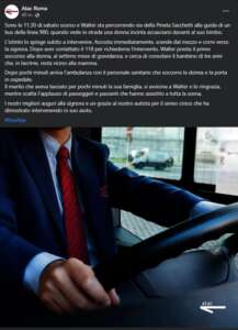 Dopo aver contattato il 118 per richiederne l’intervento, Walter ha prestato il primo soccorso alla donna, al settimo mese di gravidanza, e cercato di consolare il bambino di tre anni che, in lacrime, è rimasto vicino alla mamma. Dopo pochi minuti è arrivata l’ambulanza con il personale sanitario che ha soccorso la donna portandola in ospedale. Il marito che aveva lasciato per pochi minuti la sua famiglia, si è avvicinato a Walter ringraziandolo, mentre è scattato l’applauso di passeggeri e passanti che hanno assistito a tutta la scena.