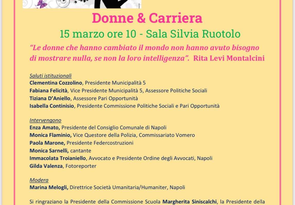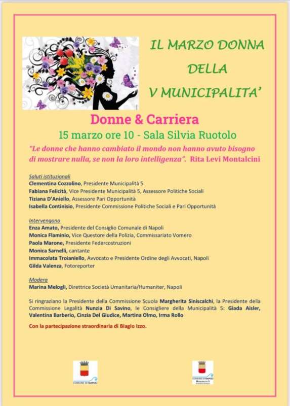 Continua il ciclo di incontri organizzato dalla V Municipalità di Napoli Arenella-Vomero nell’ambito del “Marzo Donna”. Il prossimo dibattito “Donne & Carriera” si terrà mercoledì 15 marzo alle ore 10 presso la sala consiliare Silvia Ruotolo. L’incontro sarà un’occasione per discutere sulle difficoltà che le donne incontrano a emergere in quei settori lavorativi in cui da sempre c’è una forte prevalenza maschile, ascoltando le esperienze di chi invece c’è riuscita nonostante le difficoltà. “Un’iniziativa – spiega la presidente, Clementina Cozzolino – che vuole rendere omaggio alle donne che sono emerse in settori che hanno visto da sempre la prevalenza di uomini e raccontare agli studenti e alle studentesse le loro storie. Ringraziamo Biagio Izzo per la sua partecipazione straordinaria”.