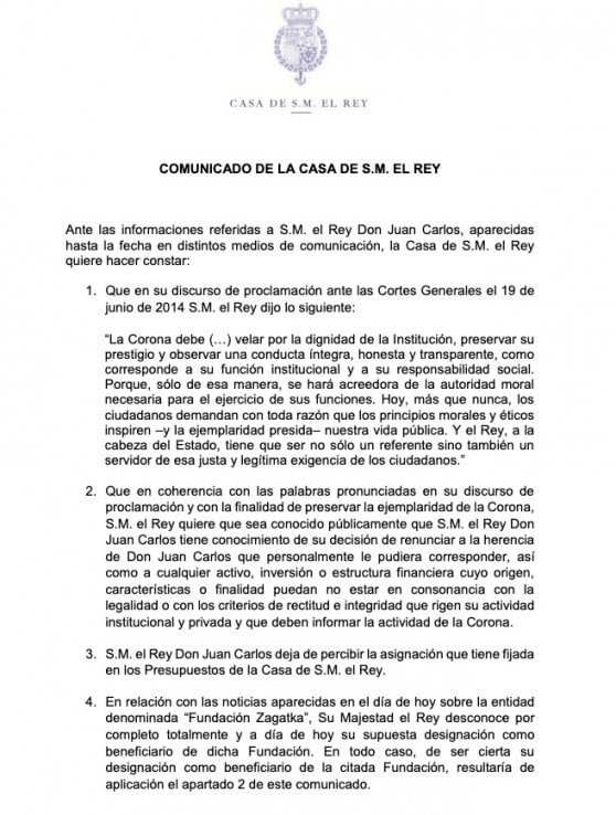 Nel comunicato diffuso dalla casa reale, Felipe VI ha ribadito di non sapere nulla di quella fondazione e ha aggiunto di essere completamente estraneo a qualsiasi tipo di affare in cui è coinvolto suo padre.