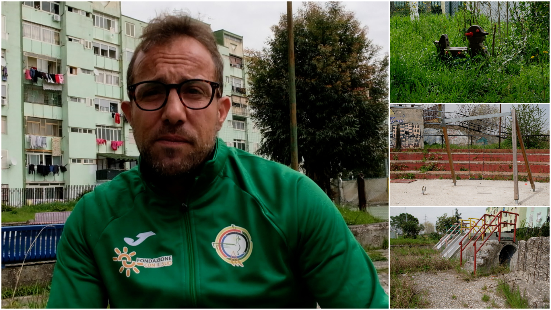 Racconta la sua storia e quella del quartiere dall’interno del parco Andersen, la villa comunale del Parco Verde, il simbolo del degrado del luogo. Doveva essere un’area giochi per i bimbi ma ora è solo erbacce e degrado. Ci sono i resti dei giochi: cubi di cemento armato con i ferri che sbucano da ogni lato dove un bimbo potrebbe ferirsi facilmente. E poi l’unica altalena del rione che i bimbi non possono usare perché è rotta. “Abbiamo più volte denunciato lo stato di abbandono di questa struttura – continua Bruno – Nel 2015 la Prefettura di Napoli e Caserta attraverso il progetto ‘Io scelgo la strada giusta’ hanno realizzato all’interno di quest’area un campetto realizzato con i pneumatici fuori uso. Hanno messo anche un’altalena, che però oggi è rotta. E comunque per mille bambini non basta”.