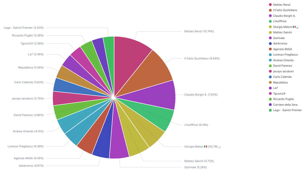 Chi sono stati i più commentati dal pubblico di Twitter? Continua il rapporto di odio e amore tra il pubblico e Matteo Renzi: dapprima male d’Italia successivamente descritto come il salvatore per aver portato ad una crisi nelle mani di Draghi. Il Fatto Quotidiano è stato surclassato di commenti negativi per l’esposizione avuta in questi mesi dal giornale e dai suoi più alti esponenti, Travaglio e Scanzi, che il tempo ha dimostrato aver sbagliato le previsioni sul Conte Ter, spazzato via appunto da Draghi. Stesso discorso per David Parenzo sempre meno gradito dal pubblico social per le sue posizioni considerate di squadra e poco professionali. Tanti commenti anche per Claudio Borghi che ha avuto l’illuminazione europeista, secondo i commenti negativi di molti media, e per Giorgia Meloni che resta all’opposizione. In questo giro troviamo un Matteo Salvini rimesso e poco polemico che passa in secondo piano se non per la sua posizione apertamente pro Governo Draghi.