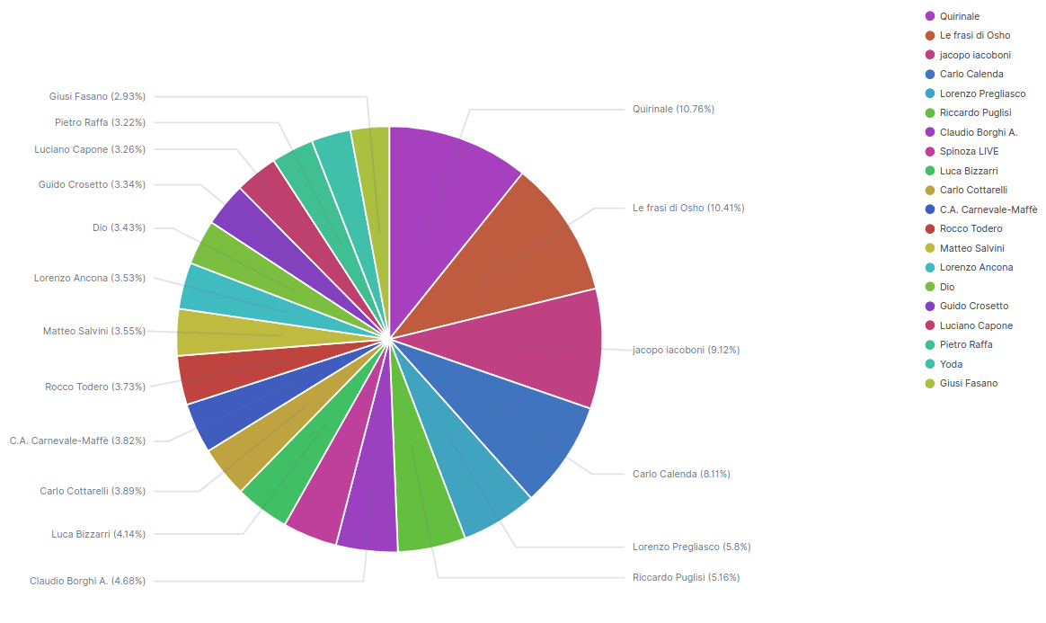 Chi ha racimolato più like sulla notizia Draghi? Secondo Varriale già da chi ha preso più apprezzamenti dal pubblico social è facile intuire anche il perché. “Il Quirinale ha avuto la meglio confermando che la presa di posizione del Presidente Mattarella ha istituzionalizzato sui social un argomento così importante, ma i like presi in eccesso da post per lo più ironici conferma che, a furia di ironizzare, si è volutamente creato un personaggio positivo. Merito anche di chi nei mesi ha preso posizioni contrastanti verso Conte come i giornalisti Jacoboni e Capone. La satira poi ha contribuito a creare un ampio spazio di visibilità grazie a profili come Spinoza, dio, Luca Bizzarri e Yoda e Osho. Calenda come politico batte tutti, ma anche grande consenso sul fronte liberista con il prof. Carlo Alberto Marfè e Carlo Cottarelli che ha espresso grande soddisfazione sapendo tra l‘altro di essere tra i papabili ad ottenere un ministero”.