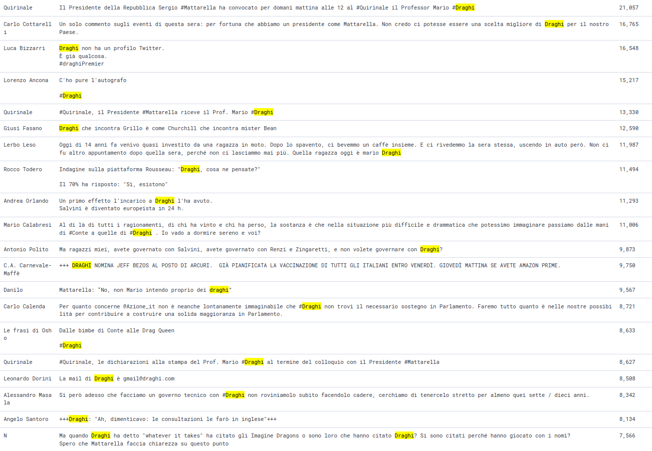 Molte testate giornalistiche hanno parlato del grande successo social di Draghi, ma il risultato che ne viene fuori non è per nulla in linea con questa lettura, anzi, secondo un’analisi Twitter che parte dal 28 gennaio al 7 febbraio 2021 del data journalist Livio Varriale, le parole chiave draghi, #quellavoltachedraghi e #consultazionidraghi hanno prodotto 246.286 tweets, 2.652.410 likes, 456.263 condivisioni, 56.170 citazioni e 340.383 commenti.