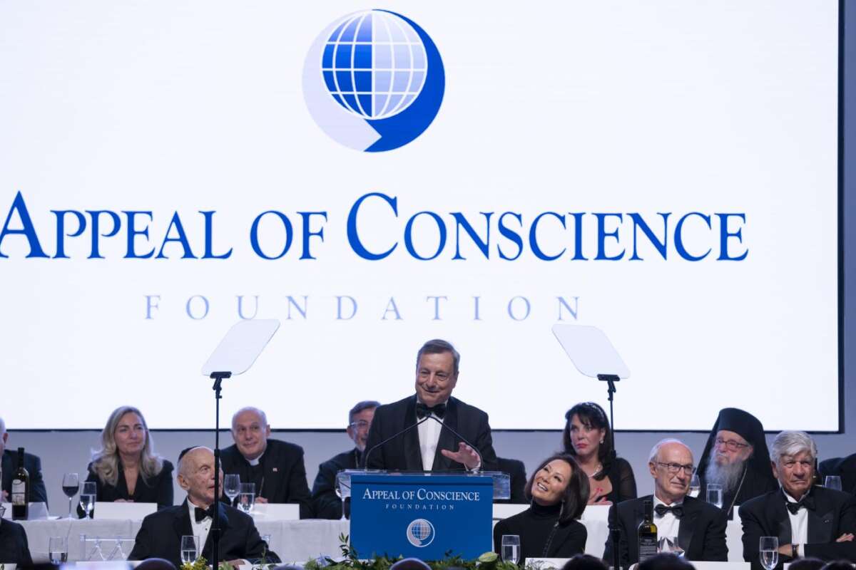 Alla 57esima edizione dell’Annual Awards Dinner della ‘Appeal of Conscience Foundation’, la fondazione che gli conferisce il premio World Statesman (statista dell’anno), che prima di lui hanno ricevuto diversi capi di Stato e di governo, da Gorbaciov ad Angela Merkel fino a Shinzo Abe, Draghi raccoglie gli elogi di tutti: dal presidente Joe Biden all’ex Segretario di Stato americano Henry Kissinger, oggi 99enne, arrivato a sorpresa (“Il suo coraggio e la sua visione faranno sì che resterà con noi a lungo”).