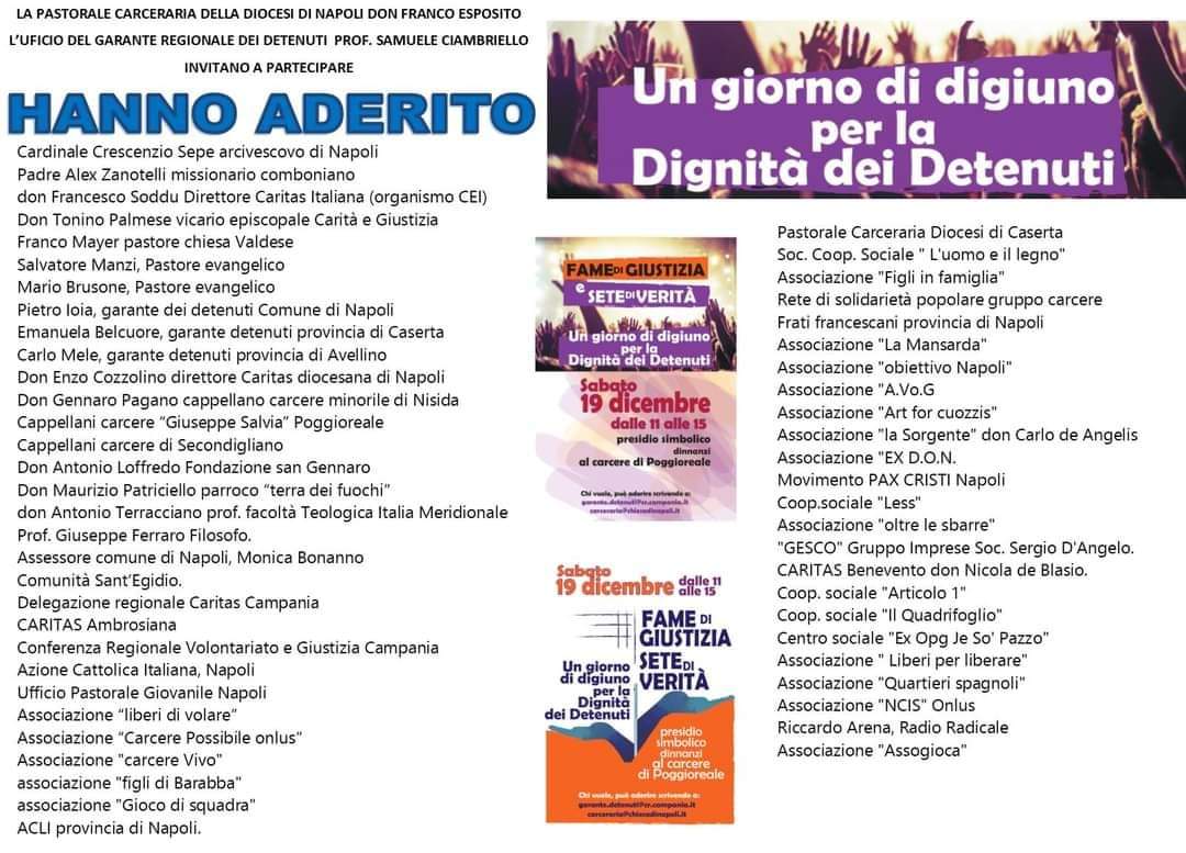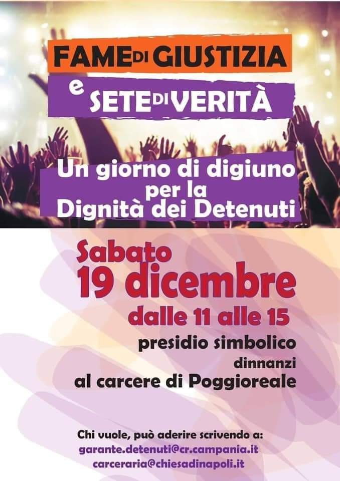 Un giorno di digiuno e di presidio nei pressi del carcere di Poggioreale di Napoli. Una giornata di mobilitazione per accendere le luci sulle condizioni di chi al momento è privato della libertà. Il totale dei detenuti positivi al coronavirus in Campania al momento è di 71, più due in gestione esterna – sono 9 (più un esterno) a Poggioreale, 60 (più uno esterno a Secondigliano), due a Benevento, 93 nel personale. La mobilitazione è stata promossa dalla Pastorale carceraria della Diocesi di Napoli, Don Franco Esposito cappellano del carcere di Poggioreale e il Garante campano Samuele Ciambriello. “Un giorno di digiuno per la dignità dei detenuti perché nessuno sia dimenticato, perché chi ha sbagliato possa pagare il suo debito non a prezzo della vita, perché chi è detenuto ha diritto alla tutela della sua vita e che il carcere non sia un luogo separato dalla società. Ogni vita deve essere salvata da un virus che non conosce limiti e barriera”.