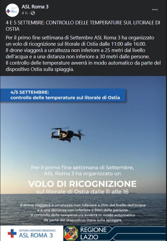 Non siamo in qualche futuro distopico immaginato da scrittori o registi catastrofisti, e nemmeno in un regime totalitario dove vengono controllate le abitudini dei cittadini. Siamo a Ostia, frazione litoranea del comune di Roma Capitale, nel decimo municipio. La Asl di pertinenza (Roma 3) ha deciso di sperimentare un’avveniristica, ma anche un po’ inquietante, soluzione per una sorta di screen di massa delle temperature degli spensierati bagnanti del litorale romano. Mentre si è in spiaggia a prendere l’ultima tintarella della stagione, un drone di non meglio specificato controllo e dimensione, sorvolerà a non meno di 25 metri di altezza le spiagge per misurare la temperatura corporea ai bagnanti.