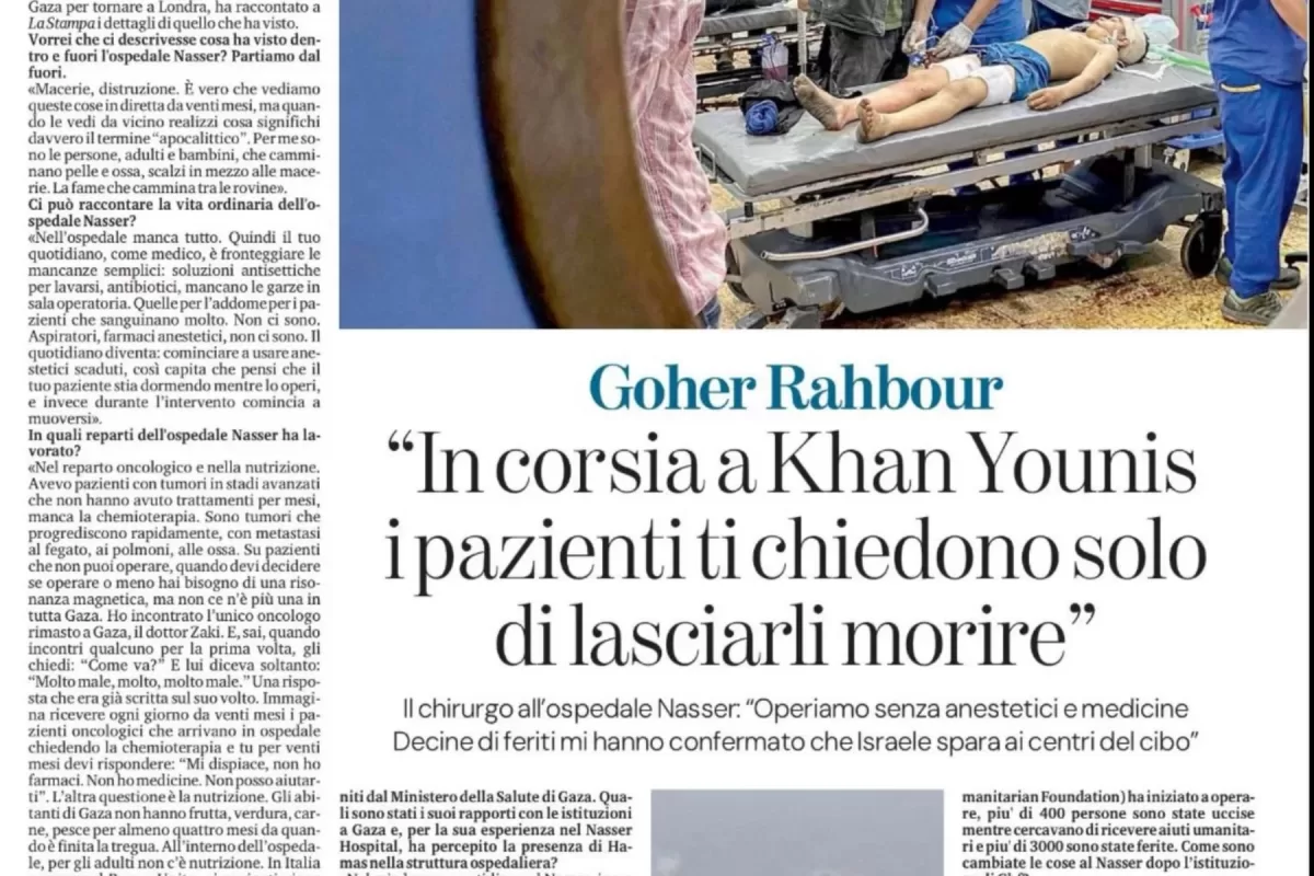 L’altro giorno La Stampa ha dedicato un paginone di intervista a certo Goher Rahbour: “Un medico britannico”, spiega il giornale torinese, “che ha lavorato per un mese nell’ospedale Nasser di Khan Younis e che appena uscito dalla Striscia di Gaza ha raccontato a La Stampa i dettagli di quello che ha visto”. Diciamo che, prima di precipitarsi ad affidare la sua esclusiva testimonianza all’intervistatrice (Francesca Mannocchi), il dottore si era precipitato a fare altrettanto almeno un paio di volte negli ultimi venti giorni (una volta addirittura con Sky, non proprio un’emittente clandestina).
