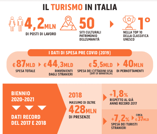 Perché il turismo è industria, e come tale va gestito. In Italia conta, in termini di PIL il 13%, calcolando l’indotto a corredo. Una industria che genera a pieno regime 4,2 milioni di posti di lavoro, con ben 50 siti culturali patrimonio dell’umanità ed è prima nella top 10 della classifica Unesco. In termini di spesa, restando a dati pre Covid, il turismo ha mosso 87 miliardi solo nel 2019, di cui 44,3 miliardi rinvenienti dagli stranieri.