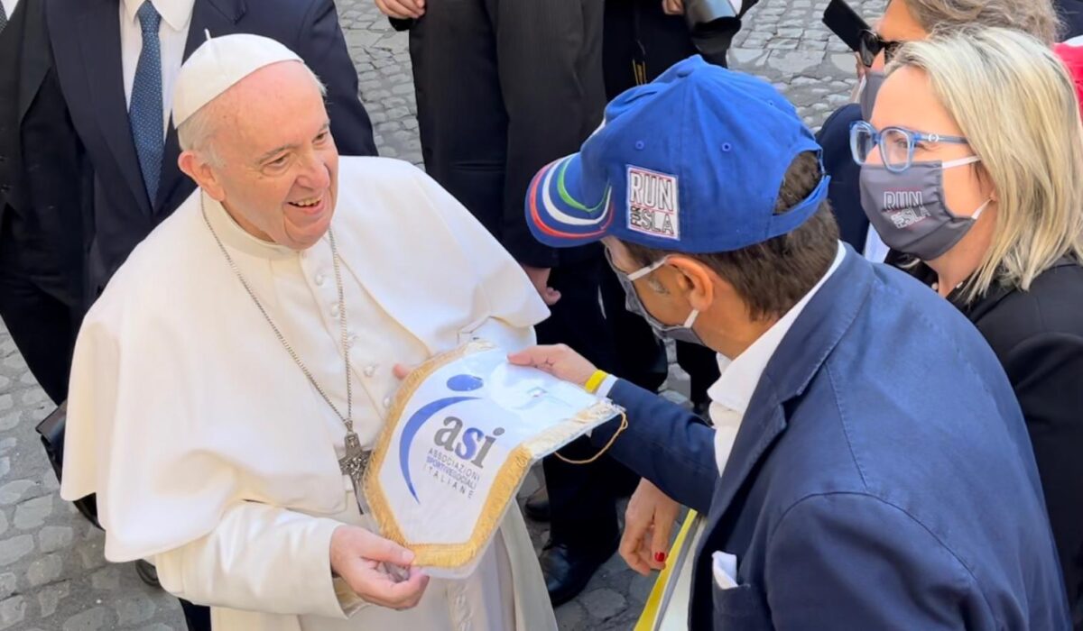 ”L’ora più buia della notte è quella che precede l’aurora”, con queste parole il Santo Padre ha accolto la delegazione della Run for SLA in udienza privata in Vaticano. La corsa a tappe quest’anno non si disputerà a causa Covid. Una delegazione ASI, patrocinatore e presente anche nel comitato organizzatore della manifestazione, ha donato a Papa Francesco il gagliardetto dell’Ente. ”Anche lo Sport di Base, come tutto il Paese, sta faticosamente uscendo da questa notte buia”, ha così detto, al Santo Padre, Bruno Campanile, Vicepresidente di ASI, presente insieme con il Consigliere Nazionale Davide Magnabosco.