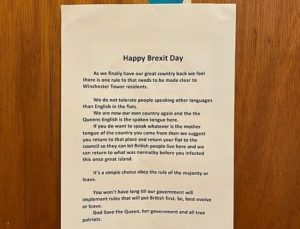 “Qui da oggi si parlerà solo inglese. Altrimenti tornatevene a casa vostra, così non infetterete più il nostro Paese”. Queste parole sono apparse su volantini affissi in tutti i piani di un condominio popolare di Norwich, in Inghilterra. Sono passati solo pochi giorni dall’uscita del Regno Unito dall’Unione Europea eppure gli effetti si fanno già sentire. A poche ore dall’ufficialità della Brexit, infatti, basta un messaggio razzista a scatenare polemiche già accese. La lettera scritta nell’edificio “Winchester Tower” si chiama “Happy Brexit Day”, felice giorno della Brexit. A riportare la notizia e l’Indipendent, che ha raccolto lo scatto divenuto subito virale sui social. Il consiglio comunale a nord-est di Londra si è espresso sulla vincendo commentando la loro indignazione e intolleranza nei confronti di questi messaggi discriminatori: “La nostra città è stata sempre accogliente e generosa e non permetteremo simili messaggi di intolleranza”.