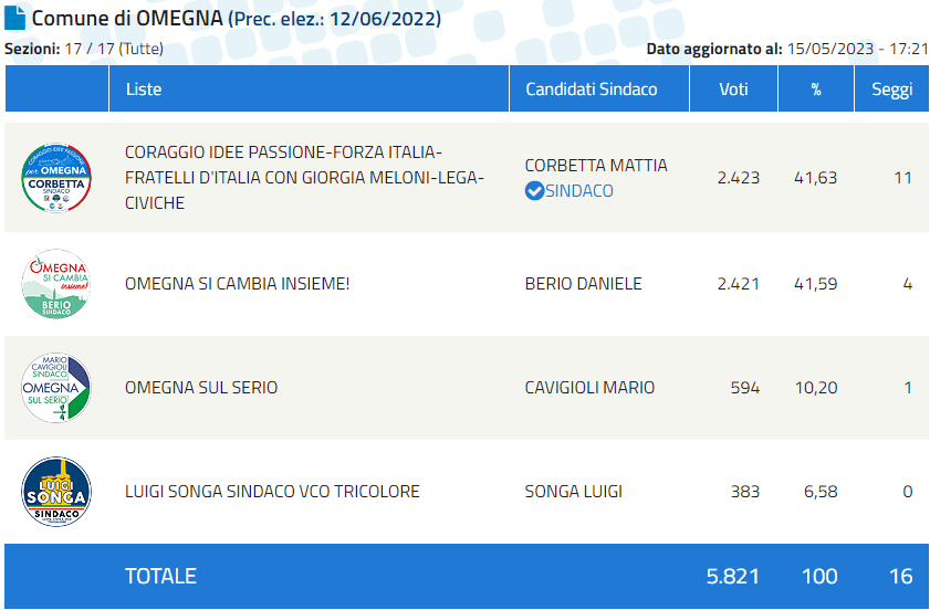 ORE 17:33 – OMEGNA, SINDACO ELETTO PER 2 VOTI – A Omegna (provincia di Verbano-Cusio-Ossola ) è stato eletto sindaco il candidato di centrodestra Mattia Corbetta con 2,423 voti, appena due in più di Daniele Berio. Terzo candidato del Terzo Polo Mario Cavigioli che ha ottenuto il 10,2% delle preferenze.