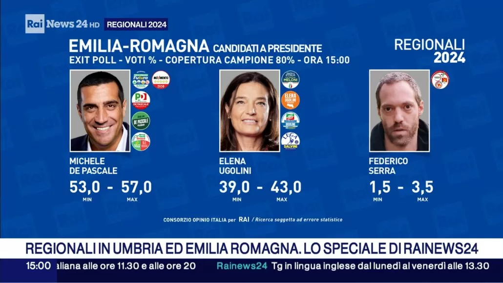 Stando ai primi exit poll Consorzio Opinio Rai, sulla base di un campione dell’80%, il candidato di centrosinistra Michele de Pascale oscilla tra il 53 e il 57% delle preferenze mentre la candidata di centrodestra Elena Ugolini oscilla tra il 39 e il 43%. Il candidato di sinistra Federico Serra otterrebbe tra l’1,5 e il 3,5% dei consensi.