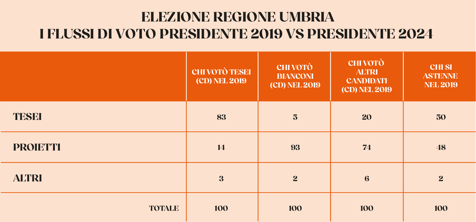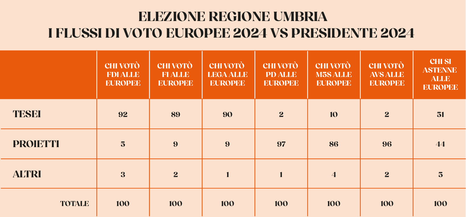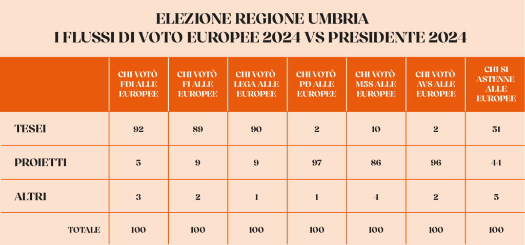 Per Livio Gigliuto la mutazione, rispetto a qualche anno fa, sta nel fatto che gli elettori centristi votano spesso per partiti che non si autodichiarano tali: «Un moderato può votare il Pd come FdI. Questo per effetto delle leadership, che concentrano su di sé i consensi delle coalizioni. Questo fenomeno si nota di più a sinistra perché a destra c’è un partito ormai storico e radicato nei territori come Forza Italia, che parla direttamente all’elettorato di centro». Dunque il presidente dell’Istituto Piepoli, più che guardare la dimensione dei consensi dei partiti, rimarca l’impatto di una candidata moderata e centrista come Proietti: «Ha vinto attraendo una parte non irrilevante di elettori che nel 2019 avevano votato per Tesei».