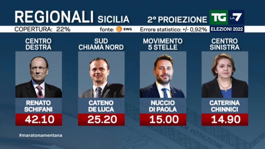 ORE 16:05 – Secondo le seconde proiezioni di Swg per il tg di La7, la Regione Sicilia va al centrodestra. Con una copertura del campione del 22 per cento Renato Schifani può contare su oltre il 42 per cento dei voti, davanti all’ex sindaco di Messina Cateno De Luca, leader del movimento ‘Sud chiama Nord’ al 25,2 per cento. Alle loro spalle Nuccio Di Paola del Movimento 5 Stelle al 15% e solo quarta Caterina Chinnici, del centrosinistra, al 14,9 per cento. In Sicilia il sistema elettorale non prevede il doppio turno, viene eletto chi prende più voti.