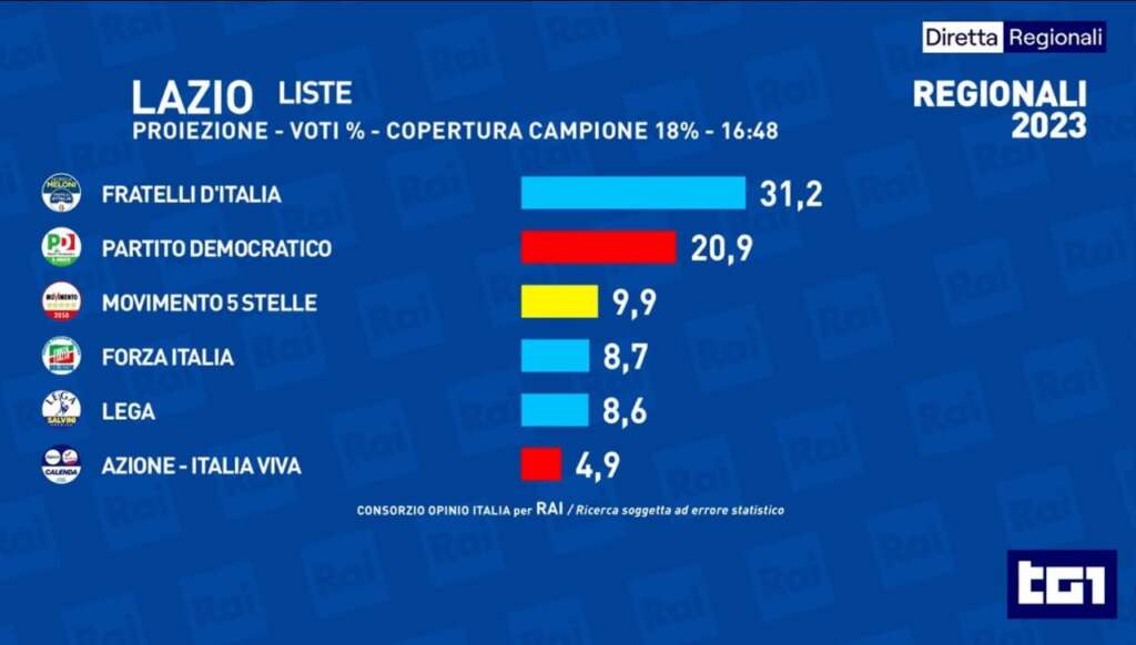 Ore 17:10 – In base alla seconda proiezione del Consorzio Opinio Italia per Rai per le elezioni regionali, nel Lazio Fratelli d’Italia è primo partito con il 31,2%, seguono il Partito Democratico con il 20,9%, il Movimento 5Stelle con il 9,9%, Forza Italia 8,7%, Lega 8,6%, Azione -Italia Viva 4,9%. La lista civica D’Amato presidente è al 3,1%, Alleanza Verdi-Sinistra 2,3%, Lista Civica Rocca Presidente 2,3%, Noi Moderati-Rinascimento 1,9%, Polo progressista Sinistra Ecologista all’1,2%, altre 5%. La copertura del campione è del 18%.