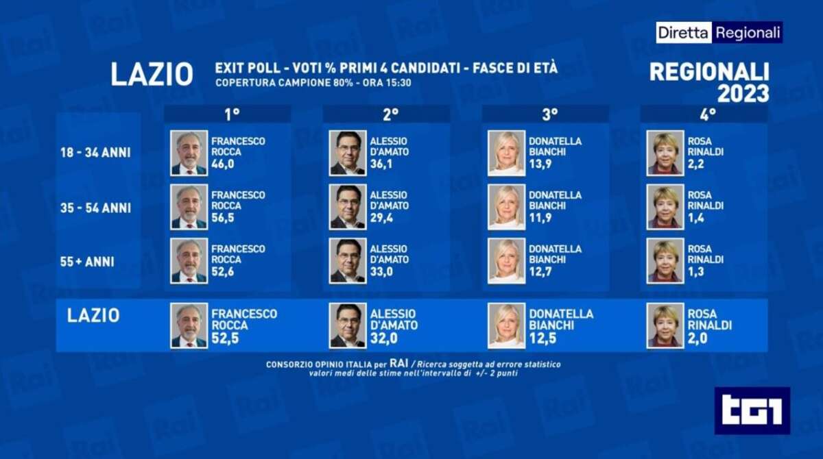 Ore 15:55 – Francesco Rocca, candidato del centrodestra nel Lazio, è stato il più votato nella regione da tutte le fasce d’età. Lo rivela l’exit poll del Consorzio Opinio Rai: Rocca si sarebbe imposto con il 46% tra i giovani elettori tra i 18 e i 34 anni, con il 56,5% tra i 35-54 anni e con il 52,6% tra i votanti con più di 55 anni. Al secondo posto in tutte le fasce di età il candidato del centrosinistra Alessio D’Amato, rispettivamente con il 36,1%, 29,4 e 33%.