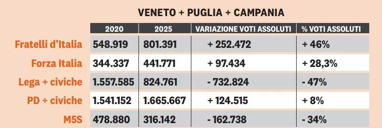 Sono stati 800mila gli elettori veneti, pugliesi e campani che, domenica, si sono espressi a sostegno del primo partito di maggioranza in Parlamento. È come se l’intera città di Torino avesse votato in toto per FdI. Solo Forza Italia e il Pd, con l’appoggio delle liste civiche di territorio, rivendicato altrettanto un saldo positivo. Ma di gran lunga ridotto. La prima guadagna 97mila voti (+28,3%) su quelli di cinque anni fa. Mentre il partito guidato da Elly Schlein resta il primo, con 1,6 milioni di elettori complessivi fra le tre regioni e avanza di 124mila voti. Una forza che, tradotta in percentuale, si ridimensiona a +8% rispetto al 2020. Nulla di ché.