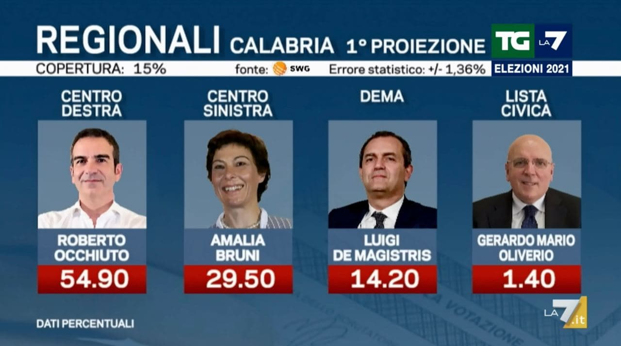 15:10 – La ‘tendenza’ secondo Swg-La7 è di una vittoria di Occhiuto e del centrodestra, con un “effetto Lucano” per de Magistris.