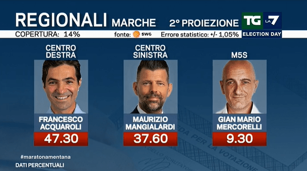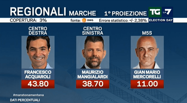 PRIMA PROIEZIONE – Secondo la prima proiezione di Swg per La 7 (copertura 3%), Acquaroli è al 43.8%. Si riduce il vantaggio su Mangialardi, dato al 38.7%. Segue il grillino Mercorelli con l’11%.