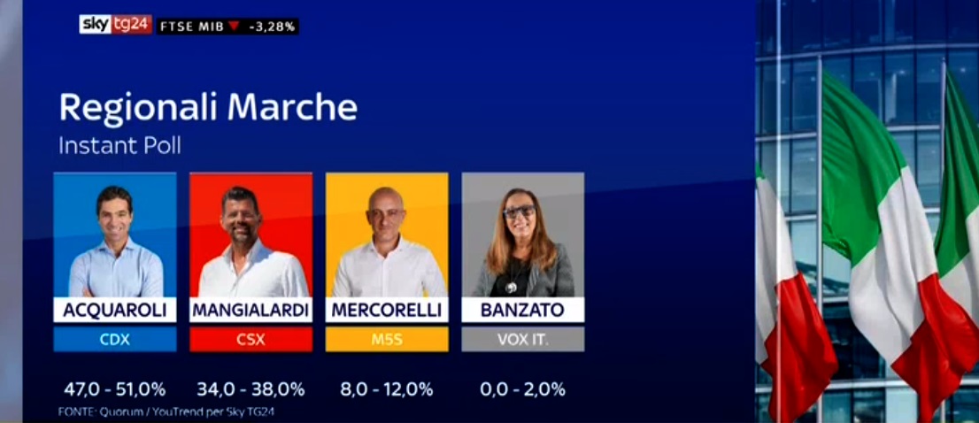 TENDENZE IN TEMPO REALE – Secondo gli Instsant Poll di Sky tg24, Acquaroli (centrodestra) è in largo vantaggio. La percentuale di voti oscilla tra il 47 e il 51%. Segue ad almeno 10 punti di distacco Mangialardi (centrosinistra) che oscilla tra il 34 e il 38%, Mercorelli (M5S) tra l’8 e il 12% e Banzato (Vox it) tra 0 e 2%.