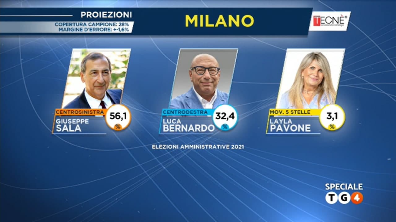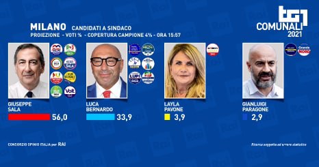 Ore 17.00 – Nuova proiezione (copertura campione 28%) Tecnè per Mediaset confermano ancora una volta la forbice tra Sala e Bernardo. Sala si attesta al 56,1%, Luca Bernardo al 32,4% e Layla pavone al 3,1%.