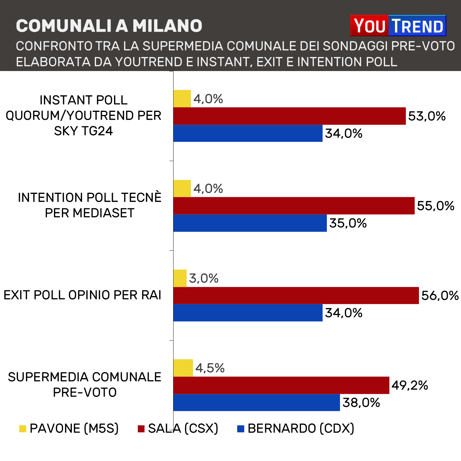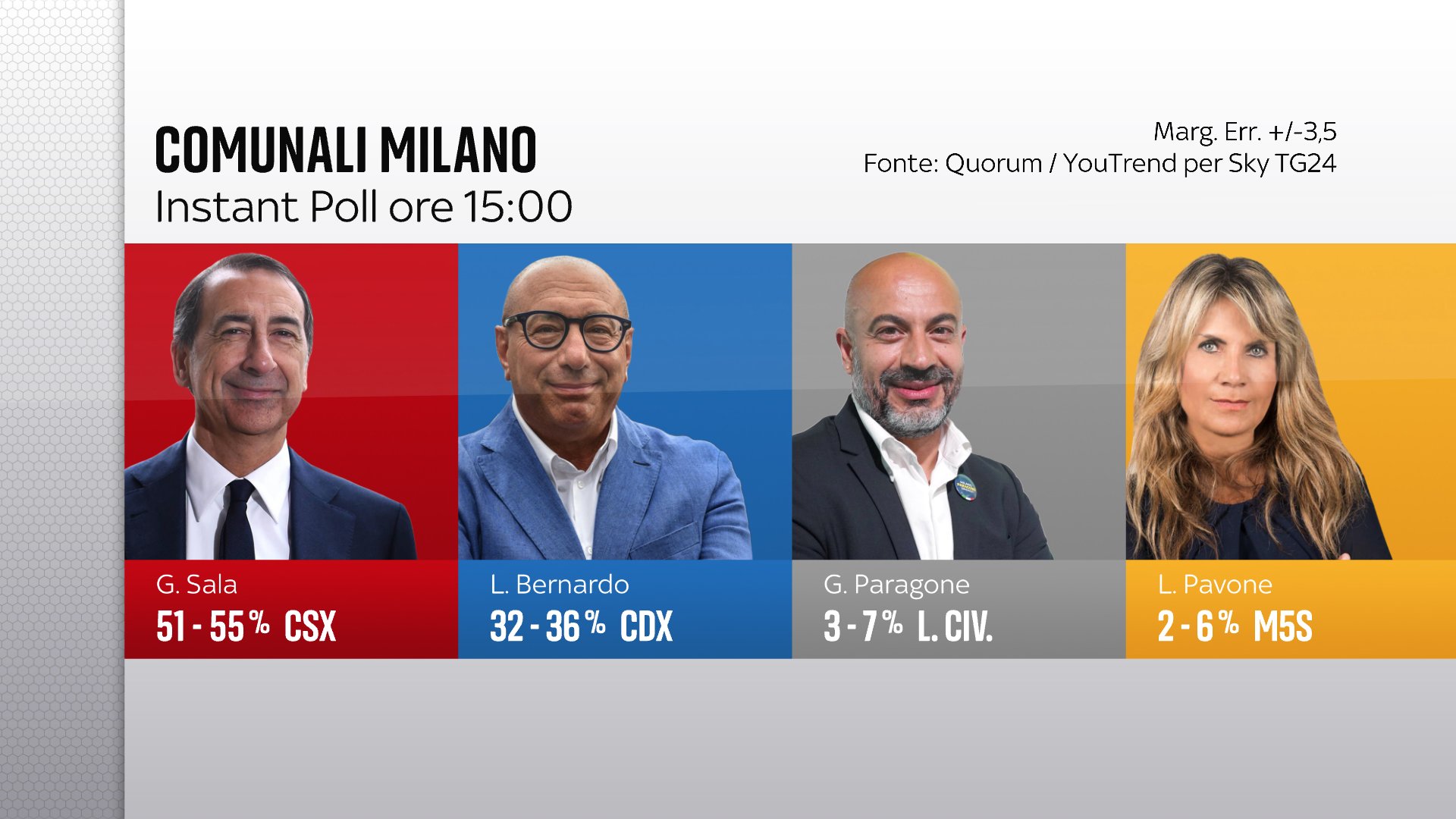 Ore 15.00 – Si chiudono le urne e iniziano i primi instant poll diffusi da YouTrend. I primi instant Poll danno Beppe sala in testa al 51% – 55%, Luce Bernardo 32% – 36%. Molto distante invece c’è Gianluigi Paragone al 3% – 7% e infine Layla Pavone al 2% – 6%. In base al primo Exit poll del consorzio Opinio Italia per la Rai, alle comunali a Milano il candidato Giuseppe Sala (centrosinistra) raggiunge una forchetta del 54-58%. seguito da Luca Bernardo (centrodestra.) con il 32-36%. Seguono Layla Pavone e Gianluigi Paragone, entrambi con una forchetta del 2-4%. Anche in base al primo Intention Tecne’ per Mediaset, alle comunali a Milano il candidato Giuseppe Sala (centrosinistra) raggiunge una forchetta del 53-57 seguito da Luca Bernardo con 33-37 e Layla Pavone (M5s) 2-6.