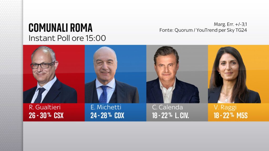 15.30 – Ecco i dati degli instant poll di Quorum/Youtrend per Sky TG24: Roberto Gualtieri del centrosinistra si attesta al 26-30%; il candidato del centrodestra Enrico Michetti al 24-28%; Carlo Calenda al 18-22% e la sindaca uscente Virginia Raggi al 18-22%. Altri candidati 5-7%.