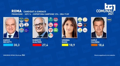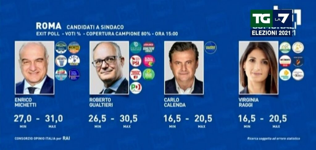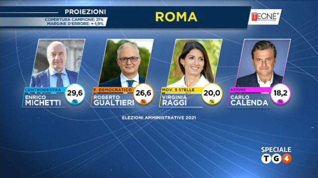 Secondo le diverse proiezioni di voto, nella corsa al Campidoglio la sfida al ballottaggio dovrebbe essere tra il candidato del centrodestra Enrico Michetti e quello del centrosinistra Roberto Gualtieri. Dietro ci sono Virginia Raggi del M5S e Carlo Calenda di Azione.