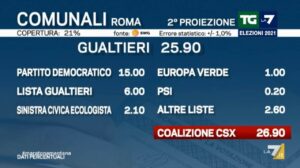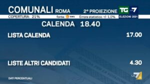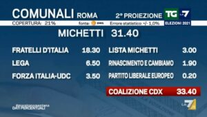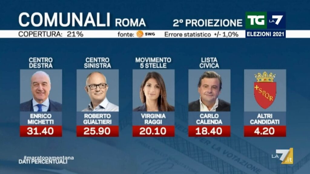 16.45 – PRIMA PROIEZIONE SWG PER LA 7 (Copertura 9%): Michetti è avanti con il 31,8%. Leggermente più netto il vantaggio di Gualtieri (24,1%) su Virginia Raggi (21,1%). Staccato Calenda (18%). Gli altri candidati sono al 5%.