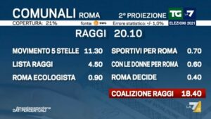 19.00 – NUOVA PROIEZIONE SWG PER LA7 (Copertura campione 21%): Per SWG, Enrico Michetti sarebbe in testa con il 31.40%, il dem Roberto Gualtieri avrebbe ottenuto il 25.90%. In terza posizione Virginia Raggi del M5S che avrebbe ottenuto il 20.10% delle preferenze e infine Carlo Calenda, leader di Azione, avrebbe ottenuto il 18.40%.