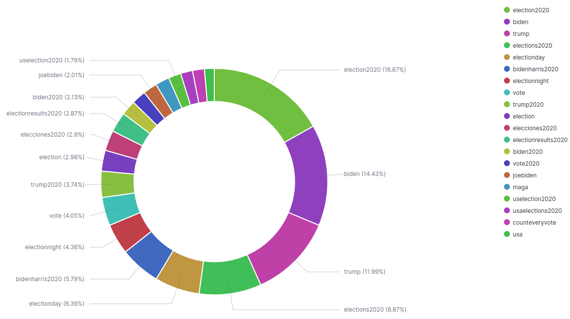 Le parole analizzate sono Trump, Biden e election. Lo scontro politico, finito con la vittoria di Biden e le lamentele di Trump che invece di accettare la sconfitta ha avviato una serie di ricorsi per contare daccapo le preferenze, è andato oltre il solito audience da vincitori e vinti generando una mole di informazioni nei giorni del voto simile al totale della campagna elettorale in sei mesi.