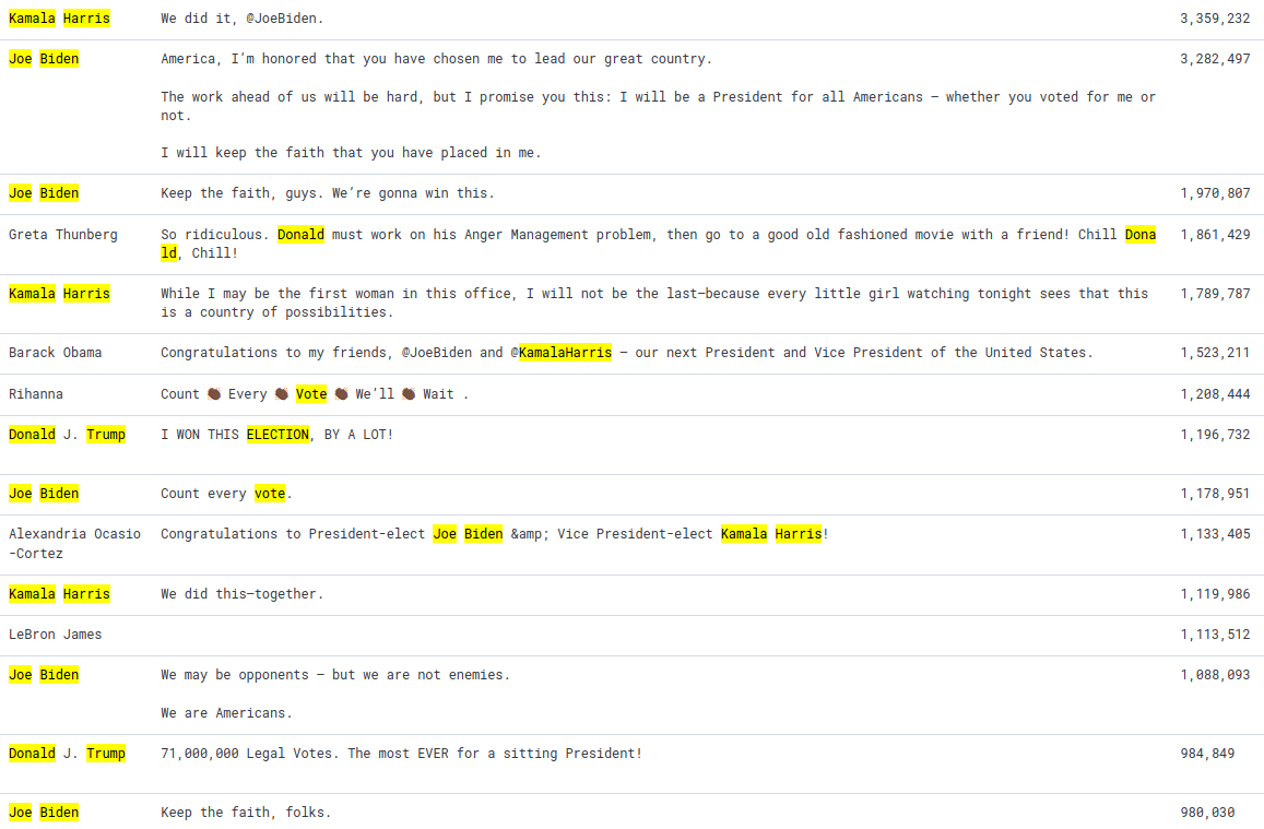 Anche dai top tweets è chiaro che Biden non sia il personaggio più gradito. Kamala Harris ha praticamente sbaragliato tutti con il suo post di congratulazioni che ha totalizzato 3.5 milioni di likes, contro i 3.2 milioni di Biden. C’è spazio anche per Greta Thunberg e per la Ortez, altra donna impegnata in politica con Biden, più l’immancabile Obama che sembra essere il regista di questa operazione politica riuscita contro Donald Trump.