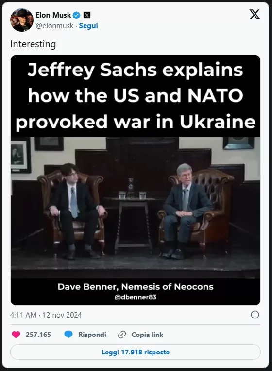 Elon Musk ha postato su X un video dell’economista statunitense Jeffrey Sachs, dove l’ex professore della Columbia University ricorda la promessa fatta a Gorbaciov dall’allora Segretario di Stato americano James Baker, secondo cui l’Alleanza Atlantica non si sarebbe espansa a Est se avesse accettato la riunificazione della Germania. Promessa tradita negli anni successivi.