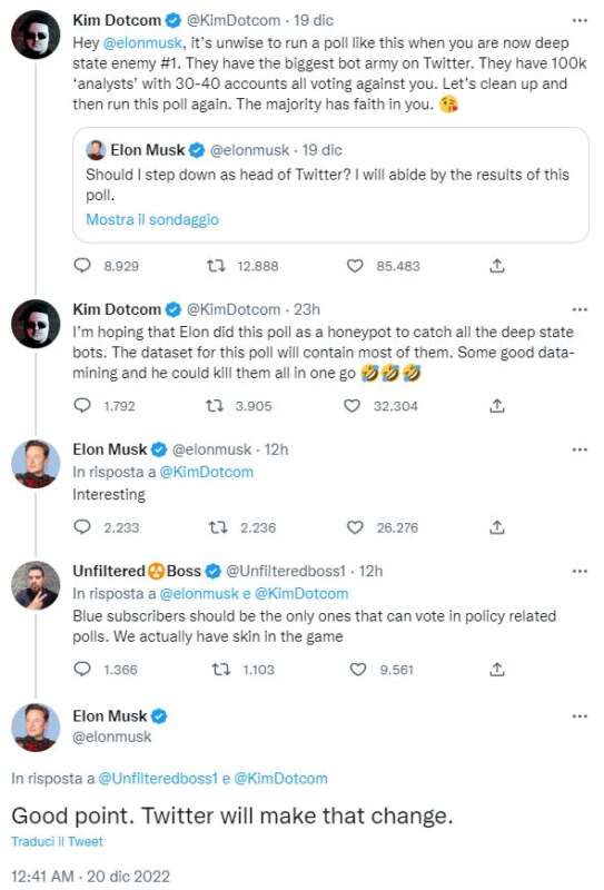 L’imprenditore sudafricano potrebbe però riservare una nuova sorpresa, l’ennesima in questi mesi di gestione pazza della compagnia. Rispondendo ad una discussione sul profilo Twitter di Kim Dotcom, celebre fondatore della piattaforma Megaupload, Musk si è detto a favore di una revisione delle regole sul social network, in modo da consentire solamente agli account a pagamento di partecipare ai sondaggi che determinano le politiche di Twitter.