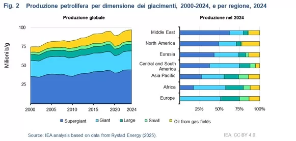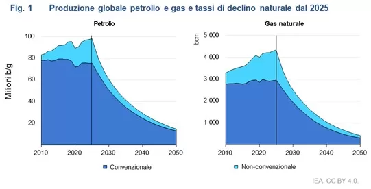 Nel rapporto si legge, infatti, che dal 2019 in avanti quasi il 90% degli investimenti upstream non è stato destinato a soddisfare la crescita della domanda, ma semplicemente a compensare il naturale declino dei giacimenti che nella maggior parte dei casi sono in produzione da diversi decenni. Dunque, se tutti gli investimenti cessassero oggi, il rapporto afferma che la produzione globale di petrolio diminuirebbe annualmente dell’8%, cioè 5,5 milioni b/g in meno ogni anno, il che equivarrebbe a cancellare la produzione di Brasile e Norvegia insieme. Per il gas naturale, il calo sarebbe ancora più netto: il 9% all’anno, pari a 270 miliardi di metri cubi all’anno, cioè la produzione attuale dell’intera Africa. Resta il fatto che i tassi di declino variano a seconda della geografia, del tipo di risorsa e delle dimensioni del giacimento. I giacimenti supergiganti in Medio Oriente, ad esempio, diminuiscono lentamente, spesso al di sotto di un 2% all’anno, mentre i giacimenti offshore piccoli o poco profondi possono perdere più del 10% della produzione ogni anno. Le fonti non convenzionali, in particolare il petrolio e il gas di scisto degli Stati Uniti, sono altamente produttive ma soggette a cali, senza nuovi investimenti, stimati intorno al 35% solo nel primo anno.