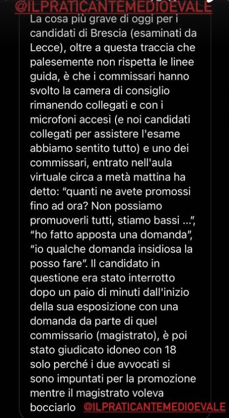 Un colloquio poi finito sui social, tramite il profilo Instagram di ‘Il praticante medioevale’. Nell’audio, che gli aspiranti avvocati hanno potuto ascoltare perché il commissario collegato da remoto aveva lasciato il microfono acceso, si sente dire: “Quanti ne avete promossi fino ad ora? Non possiamo promuoverli tutti stiamo bassi”.