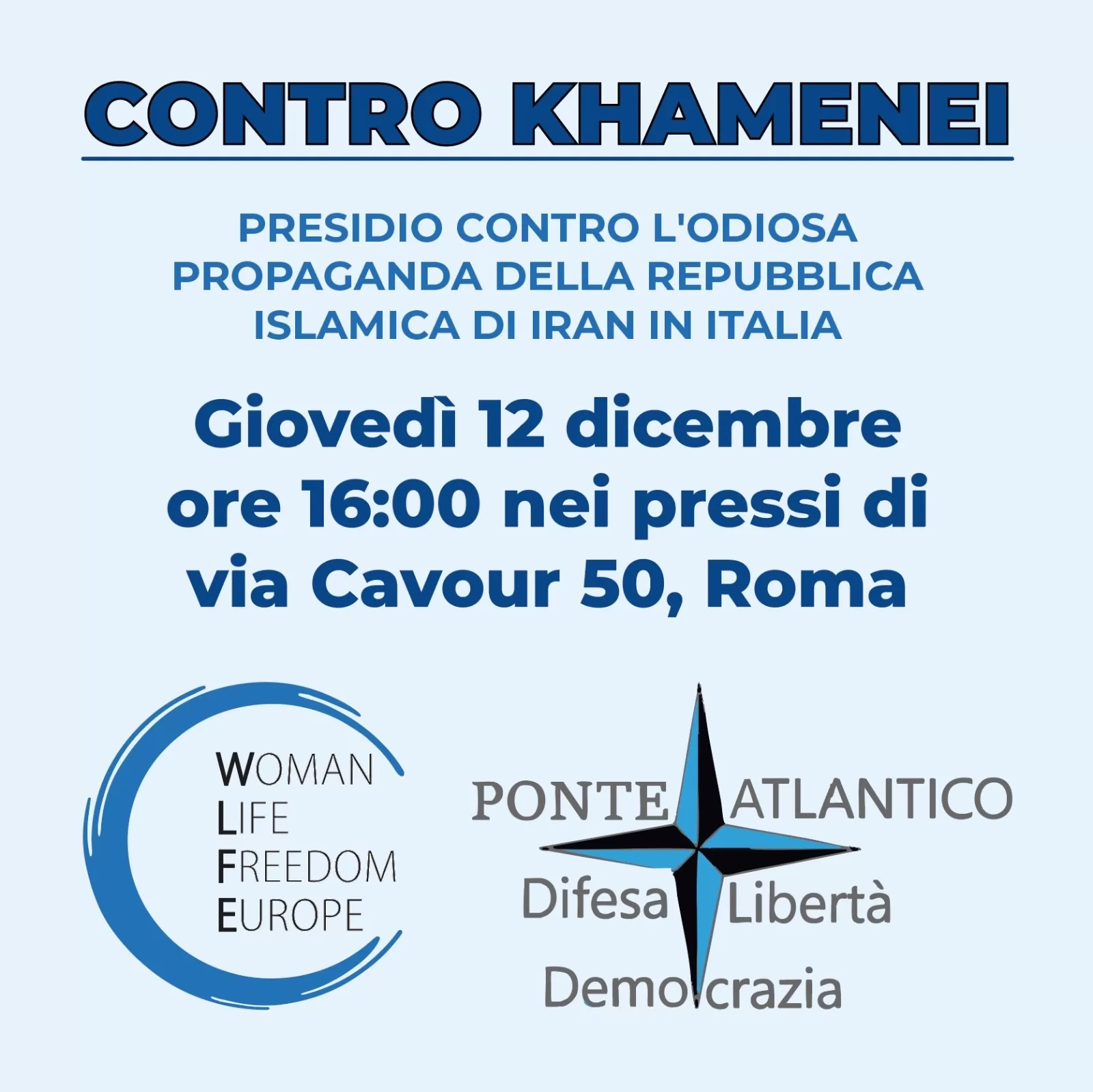 Alla luce di queste e altre constatazioni, la presentazione nella Capitale d’Italia dell’autobiografia dell’ayatollah Khamenei appare una vera e propria indecenza, un’ingiuria a tutta la democrazia italiana. Per manifestare il nostro sdegno, l’associazione Ponte Atlantico e Woman Life Freedom Europa hanno indetto un presidio (“Contro Khamenei”) di fronte alla sede dell’evento: per tutti, l’appuntamento è alle 16 di giovedì prossimo, in via Cavour all’altezza del numero 50.