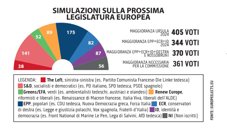 La crescita della destra estrema sarebbe, se i sondaggi venissero confermati, il dato politico delle elezioni 2024: tra il buon risultato che attualmente viene dato ai partiti di Identità e Democrazia in Francia, Bulgaria, Romania e Germania ed il risultato olandese, ammesso e non concesso che si mantenga tale da qui a giugno, il risultato un po’ deludente (rispetto al 2019) che ci si aspetta in Italia con la Lega di Salvini sarebbe più che attutito. Ma questo quadro non sarebbe sufficiente, al momento, per spostare gli equilibri politici: la “maggioranza Ursula” continuerebbe infatti, rebus sic stantibus, ad essere tale, con 405 deputati rispetto ai 420 attuali, ben oltre i 361 richiesti per la maggioranza qualificata con cui si elegge la presidente della Commissione. C’è però un “ma” grande quanto un macigno. Nel 2019 infatti Ursula von Der Leyen fu eletta nonostante tra i socialisti vi fossero stati molti franchi tiratori, che impattarono su quasi la metà del gruppo di S&D: se così fosse, coi numeri attuali, la maggioranza “Ursula” non ci sarebbe più, avendo bisogno di gruppi decisamente più compatti rispetto al 2019.